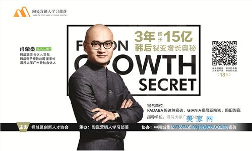 2017年8月12日,由禪城區(qū)創(chuàng)新人才協(xié)會(huì)主辦,陶瓷營(yíng)銷人學(xué)習(xí)部落承辦,臥龍咨詢、中陶城集團(tuán)、PADARA瓷磚聯(lián)合協(xié)辦,PADARA瓷磚、GIANIA嘉尼亞陶瓷、照舊陶瓷冠名贊助、混沌研習(xí)社廣州分社全程支持,特別邀請(qǐng)韓后總裁肖榮燊先生進(jìn)行《3年增長(zhǎng)15億——韓后裂變?cè)鲩L(zhǎng)奧秘》主題分享會(huì)將在佛山陶瓷總部基地劇場(chǎng)隆重舉行。