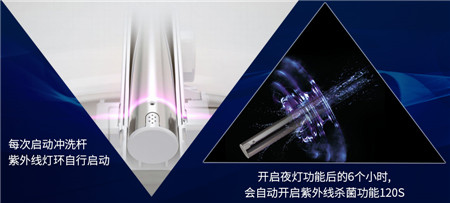 紫外線燈環(huán)伴隨沖洗桿伸出,自行啟動,對沖洗桿噴頭進(jìn)行殺菌。