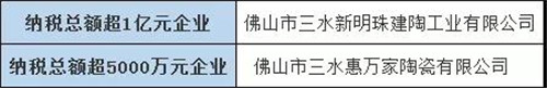 5月17日,佛山市三水區(qū)人民政府發(fā)布2018年度三水區(qū)納稅大戶名單。其中,佛山市三水新明珠建陶工業(yè)有限公司、佛山市三水區(qū)惠萬家陶瓷有限公司分別以納稅總額超1億元和5000萬元名列榜單前茅。