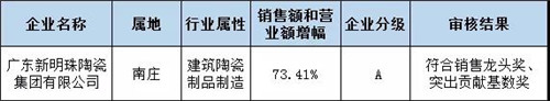 5月27日,佛山市禪城區(qū)經(jīng)濟(jì)和科技促進(jìn)局公示了2018年度“百企爭先”銷售龍頭獎(jiǎng)和突出貢獻(xiàn)基數(shù)獎(jiǎng)擬獎(jiǎng)勵(lì)名單。新明珠陶瓷集團(tuán)以73.41%的銷售額和營業(yè)額增幅,攬獲銷售龍頭獎(jiǎng)和突出貢獻(xiàn)基數(shù)獎(jiǎng)兩項(xiàng)大獎(jiǎng)。