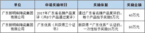 公示內(nèi)容顯示,新明珠陶瓷集團(tuán)因獲得三個(gè)“廣東優(yōu)質(zhì)”認(rèn)證證書、8個(gè)產(chǎn)品通過2017年廣東省名牌產(chǎn)品復(fù)評,擬被獎(jiǎng)勵(lì)共計(jì)100萬元。