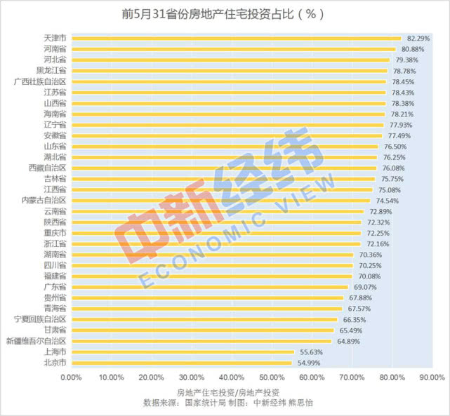 一組有意思的數(shù)據(jù)是,北京市房地產(chǎn)住宅投資占比(房地產(chǎn)住宅投資/房地產(chǎn)投資)最低為54.99%,距離北京不過(guò)100多公里的天津市卻是另一個(gè)極端,房地產(chǎn)住宅投資占比高達(dá)82.29%。上海市和江蘇省的情況同北京市和天津市有些相似,數(shù)據(jù)呈現(xiàn)兩極特點(diǎn),房地產(chǎn)住宅投資占比分別為55.63%和78.43%。