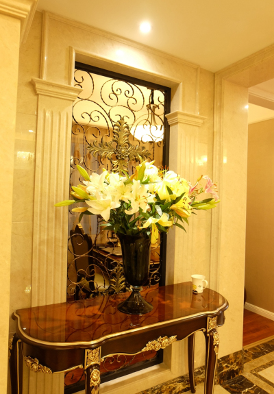 就連拐角處的設(shè)計,都注重對稱的美感。古典風(fēng)韻的鉤花窗、桌子邊緣的金色浮雕花、對稱的裝飾柱,每一處都經(jīng)過精心的設(shè)計,擺上一束盛開的鮮花,即使是拐角處,也讓人流連忘返。