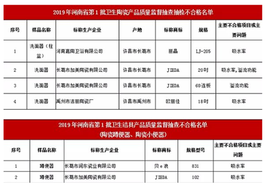 而抽檢的38家企業(yè)生產(chǎn)的100批次陶瓷蹲便器與陶瓷小便器產(chǎn)品中,有2批次蹲便器樣品同樣被檢出吸水率項(xiàng)目不合格,商標(biāo)涉及“貝e浪”、“JIEDA”。