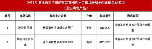 一直以來(lái),國(guó)家及地方有關(guān)部門對(duì)產(chǎn)品質(zhì)量監(jiān)督抽檢工作都是嚴(yán)抓狠打,尤其對(duì)于心存僥幸的企業(yè),更是絕不姑息。就在7月16日,浙江省市場(chǎng)監(jiān)督管理局就對(duì)質(zhì)量監(jiān)督抽查不合格且逾期未改正的企業(yè)發(fā)出警示。其中,衛(wèi)浴行業(yè)有兩家公司名單在列,分別是慈溪市長(zhǎng)河鎮(zhèn)輝業(yè)潔具廠與溫州格威特潔具有限公司。