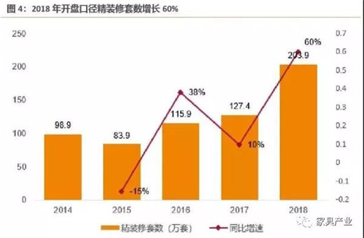 精裝修比例提升趨勢(shì)明確,2018年精裝修套數(shù)提升60%,保障相關(guān)企業(yè)未來(lái)收入快速增長(zhǎng),如大宗渠道占比高的江山歐派。