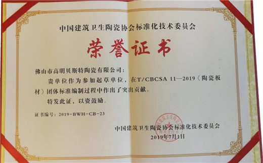 除此之外,順成曾參與制定多項(xiàng)國(guó)家和行業(yè)標(biāo)準(zhǔn)。7月19日,中國(guó)建筑衛(wèi)生陶瓷協(xié)會(huì)第八次會(huì)員代表大會(huì)上,順成明城基地(佛山市高明貝斯特陶瓷有限公司)和順成三洲基地(佛山高明順成陶瓷有限公司)更是因在T/CBCSA 11-2019《陶瓷板材》團(tuán)體標(biāo)準(zhǔn)編制過程中作出突出貢獻(xiàn)而被授予榮譽(yù)證書。