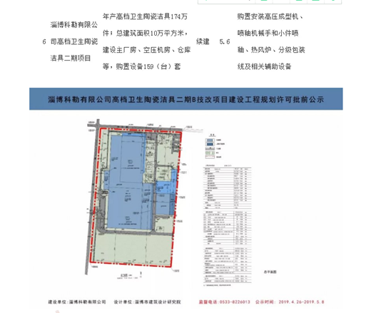 近日,山東恒臺縣公示了“淄博科勒有限公司高檔衛(wèi)生陶瓷潔具二期B技改項目規(guī)劃許可”。根據(jù)恒臺縣2017年數(shù)據(jù)顯示,淄博科勒有限公司擁有隧道窯2條,年產(chǎn)能130萬件。此次高檔衛(wèi)生陶瓷潔具二期項目規(guī)劃,總投資5.6億元,高檔衛(wèi)生陶瓷潔具年產(chǎn)能可達(dá)174萬件;總建筑面積10萬平方米,建設(shè)主廠房、空壓機(jī)房、倉庫等,購置設(shè)備159(臺)套,購置安裝高壓成型機(jī)、噴釉機(jī)械手和小件噴釉、熱風(fēng)爐、分級包裝線及相關(guān)輔助設(shè)備。據(jù)悉,目前二期項目一條生產(chǎn)線試運行,另外三條正安裝調(diào)試。