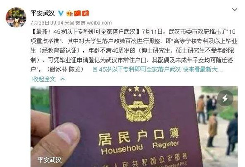 在“搶人”方面成效顯著的武漢可謂不遺余力繼續(xù)對政策加碼。7月11日,武漢市委市政府推出了“10項重點舉措”,其中對大學生落戶政策再次進行調整,即“高等學校專科及以上畢業(yè)生(經教育部認證),年齡不滿45周歲的(博士研究生、碩士研究生不受年齡限制),可憑畢業(yè)證申請登記為武漢市常住戶口,其配偶及未成年子女均可隨遷落戶”。