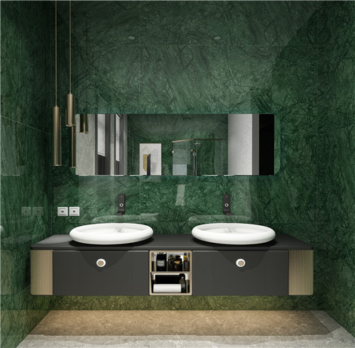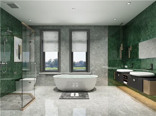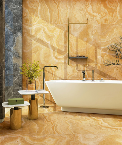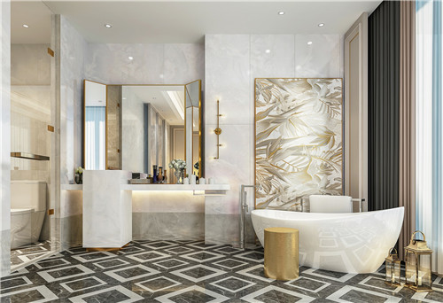 以經(jīng)典的珍稀黃龍玉為原型,整個浴室空間都散發(fā)著玉的高貴、金的奢華,以及天然玉紋的藝術(shù)美感,大膽而靈動的紋理,讓空間富有動感,耐人尋味。