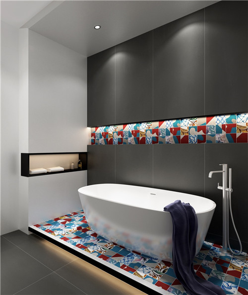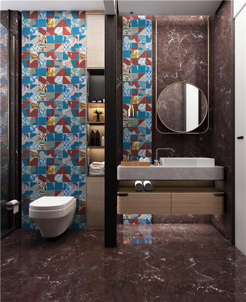 大片紫紅色塊之間夾雜著或純白或翠綠的線條,形似國畫中的梅枝招展,搭配東方傳統(tǒng)的花磚,整個衛(wèi)浴空間高雅、氣派、大方。