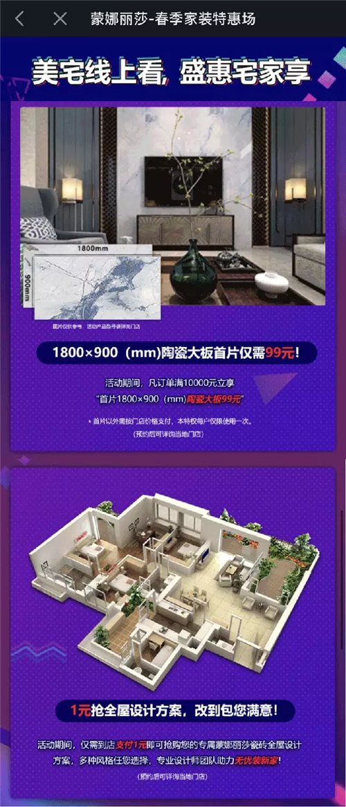 同時(shí),活動(dòng)搭建了“抖in home”家裝大牌特惠場(chǎng),設(shè)置了大牌聚惠區(qū)、直省6萬(wàn)區(qū)、互動(dòng)抽獎(jiǎng)區(qū)、城市分會(huì)場(chǎng)、爆款清單區(qū)等核心板塊,并聯(lián)合全品類家居品牌為用戶提供了各種組合福利,以鉅惠掀起2020年春季置家購(gòu)物熱潮。作為此次抖音家居節(jié)合作品牌,蒙娜麗莎瓷磚為抖音用戶提供“陶瓷大板99元”、“300元鋪貼代金券”、“9.9元購(gòu)10㎡精致廚衛(wèi)瓷磚”、“1元定制全屋設(shè)計(jì)方案”等多重優(yōu)惠政策。讓網(wǎng)友足不出戶,也能享受到置家購(gòu)物的樂(lè)趣,更能尊享到誠(chéng)意滿滿的優(yōu)惠福利。