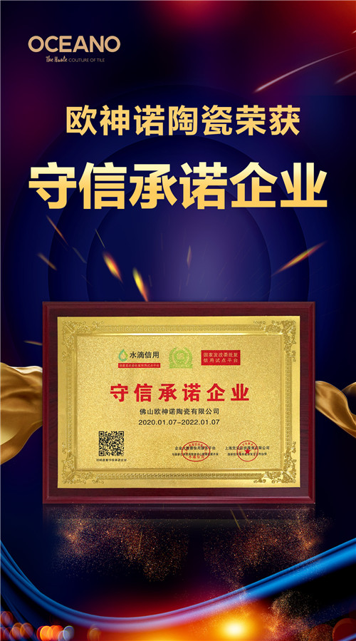 誠信,是衡量一家企業(yè)社會價值的重要標準。2020年3月,歐神諾陶瓷榮獲由國家發(fā)改會批復(fù)信用試點平臺-水滴信用頒發(fā)的「守信承諾企業(yè)」榮譽稱號,再次展現(xiàn)了歐神諾作為高端瓷磚品牌的社會形象。