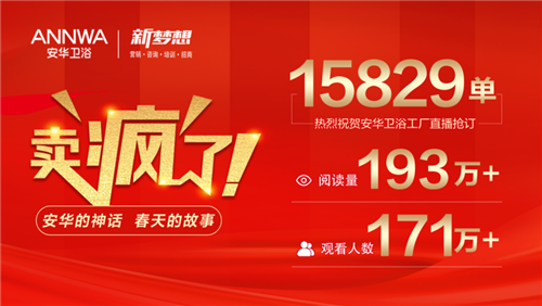 疫情無情,安華有愛。3月25日,安華“億元補(bǔ)貼 搶工廠”直播大促在佛山高明安華衛(wèi)浴總部圓滿落幕!活動(dòng)當(dāng)天超額完成銷售指標(biāo),工廠直播搶訂達(dá)到15829單,閱讀量超193萬,觀看人數(shù)超171萬!感恩全國的廣大業(yè)主朋友們選擇安華,您的支持是安華前進(jìn)的動(dòng)力!