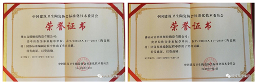 ● 2019年7月,順成因在T/CBCSA11-2019《陶瓷板材》團體標準編制過程中作出突出貢獻而被授予榮譽證書。