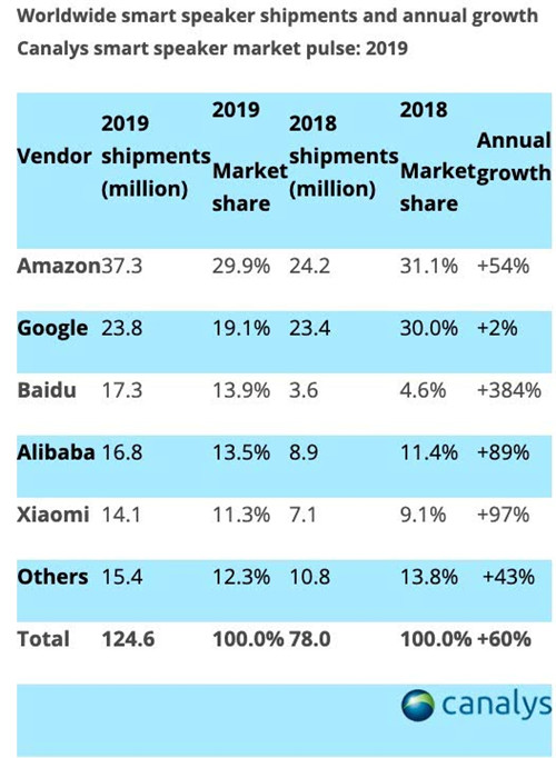此外,多家國際權(quán)威市場調(diào)研機(jī)構(gòu)(Strategy Analytics與Canalys)數(shù)據(jù)顯示,亞馬遜系列智能音箱領(lǐng)跑全球,百度則領(lǐng)跑中國市場。依據(jù)Canalys數(shù)據(jù):百度系列智能音箱在2019年出貨量1730萬臺,同比增長384%,出貨量超阿里和小米,全球排名第三,僅次于亞馬遜和谷歌。