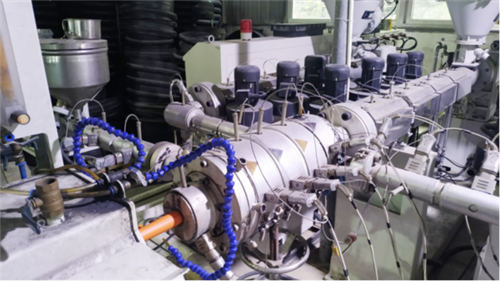 2.采用雙層共擠工藝的擠出機(jī)擠出管道,再進(jìn)入色線擠出機(jī)。
