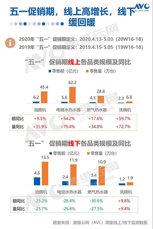 2020年被寄予厚望的五一促銷期落下帷幕,在各種政策拉動和促銷活動的刺激之下,油煙機、電熱和燃熱品類回暖跡象明顯,線上市場同比紛紛攀升至高位,線下降幅也有明顯收窄;新興的洗碗機品類,隨著疫情影響下消費者健康意識提升,同比一直呈現高速增長趨勢。