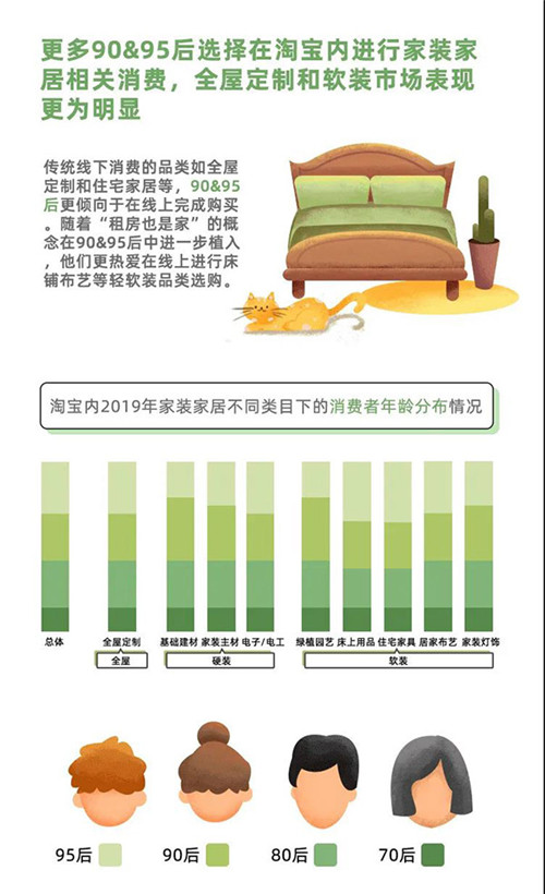 如果說(shuō)以上種種差異,或許還受到年齡這一人口統(tǒng)計(jì)學(xué)指標(biāo)的影響,不全然與代際相關(guān)。那么年輕人對(duì)全屋定制的偏好可能更說(shuō)明問(wèn)題,根據(jù)極有家與阿里媽媽聯(lián)合發(fā)布的數(shù)據(jù)顯示,在淘?xún)?nèi)進(jìn)行全屋定制的消費(fèi)群體中,90后與95后消費(fèi)者的占比超過(guò)了一半。這個(gè)數(shù)據(jù)展現(xiàn)了一種趨勢(shì),即年輕人們希望為自己的家尋找獨(dú)特且統(tǒng)一的設(shè)計(jì)風(fēng)格。有些原本在線下的家裝設(shè)計(jì)企業(yè)也抓住機(jī)會(huì)開(kāi)啟了網(wǎng)店。主打北歐風(fēng)的良十空間設(shè)計(jì),2019入駐淘寶線上,通過(guò)協(xié)調(diào)線下門(mén)店,提供全屋定制服務(wù),首年業(yè)績(jī)破億,與極有家平臺(tái)共同實(shí)踐了淘寶新零售的商業(yè)閉環(huán)。