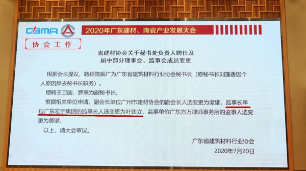 會(huì)上,協(xié)會(huì)秘書長(zhǎng)王衛(wèi)國(guó)宣讀協(xié)會(huì)提名,廣東宏宇集團(tuán)有限公司董事長(zhǎng)助理葉勁立新任廣東省建筑材料行業(yè)協(xié)會(huì)第四屆理事會(huì)監(jiān)事長(zhǎng)。