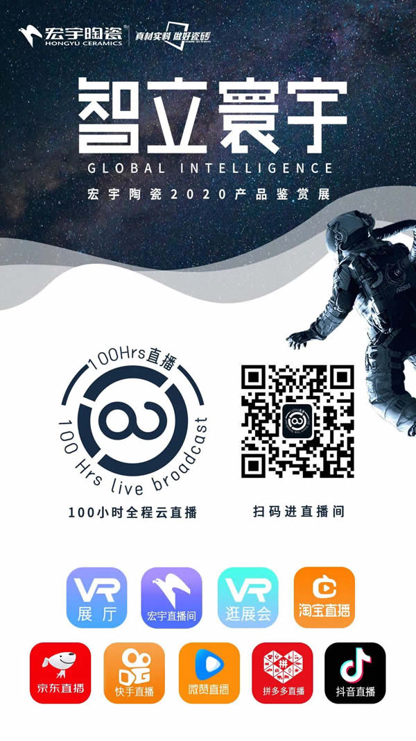 7月20日-24日,無論何時何地,只要打開手機(jī),一鍵鏈接即可親臨宏宇陶瓷“智立寰宇”超1600平米大型概念館現(xiàn)場,無縫體驗“智造7+1”未來感工程奇觀。同時,通過技術(shù)合成、多維空間聯(lián)動,實現(xiàn)3D產(chǎn)品展示、數(shù)字展廳、VR虛擬實景演示等虛實結(jié)合的100小時全程云逛展體驗,帶來一場科技感十足的直播盛宴,與全球觀眾分享中國陶瓷的超級魅力。