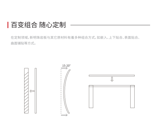 好看花色千篇一律,有曲的巖板萬(wàn)里挑一。作為一款“曲面屏”巖板產(chǎn)品,新明珠3MM纖薄巖板擁有良好的韌性,可彎曲致15~20度而不會(huì)折斷,實(shí)現(xiàn)完美的曲面無(wú)縫貼合應(yīng)用,打破“平鋪直述”的傳統(tǒng)家裝方式,百變組合,隨心訂制個(gè)性化的現(xiàn)代家居生活。
