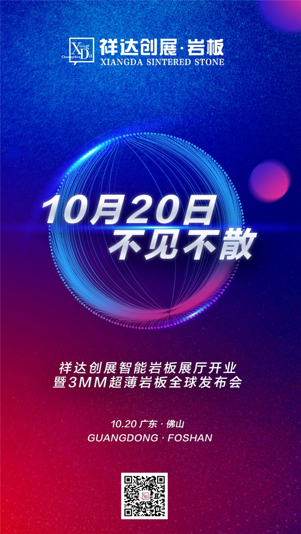 茲定于10月20日,為祥達(dá)集團(tuán)智能巖板展廳開業(yè)暨3mm超薄巖板全球發(fā)布會(huì),屆時(shí)來自世界各地的合作伙伴將有機(jī)會(huì)一睹【3mm超薄超大巖板】新品的風(fēng)采。巖板新藍(lán)海,共創(chuàng)新未來,祥達(dá)集團(tuán)誠摯邀請(qǐng)更多合作伙伴加盟,共創(chuàng)、共享、共贏!詳情請(qǐng)關(guān)注