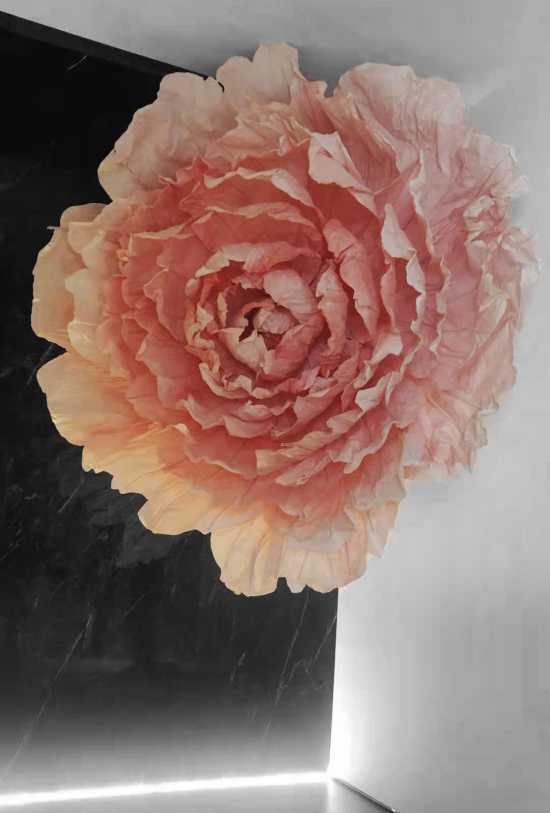 其中不得不提的是藝術館的進門處,有一朵直徑達到2500mm手工渲染紙的牡丹花。在這個充滿水泥、瓷磚、柵欄、燈光的藝術館中,一朵牡丹花的點綴,與燈光共同柔和了整個空間的冰冷感,增添了浪漫與神秘的體驗。