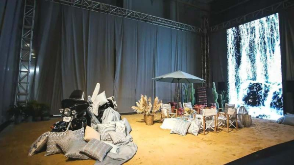 四號館長長的電梯把我們帶到了一個四周被黑色幕布圍繞、充斥著搖滾樂的空間,在沙灘、綠植、紗簾和摩托等元素的映襯下,我們有一瞬間幾乎以為穿越到了哪個海邊音樂節(jié)。好在,門口「德國JAB ANSTOETZ」(以下簡稱JAB)巨大logo的閃現(xiàn),讓大家及時放下了已經(jīng)準(zhǔn)備搖擺的雙手。