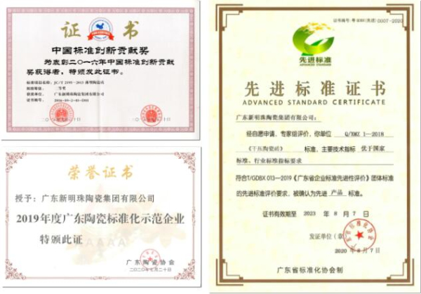 2017年,新明珠陶瓷集團(tuán)被國家標(biāo)準(zhǔn)化管理委員會(huì)授予中國標(biāo)準(zhǔn)創(chuàng)新貢獻(xiàn)獎(jiǎng);2020年7月,新明珠又被廣東陶瓷協(xié)會(huì)授予“2019年度廣東陶瓷標(biāo)準(zhǔn)化示范企業(yè)”;2020年8月,由新明珠制定并實(shí)施的Q/XMZ1—2018《干壓陶瓷磚》企業(yè)產(chǎn)品標(biāo)準(zhǔn)因產(chǎn)品主要技術(shù)指標(biāo)優(yōu)于國家標(biāo)準(zhǔn)、行業(yè)標(biāo)準(zhǔn)指標(biāo)要求,被廣東省標(biāo)準(zhǔn)化協(xié)會(huì)專家組評(píng)定為廣東省首批先進(jìn)標(biāo)準(zhǔn)。