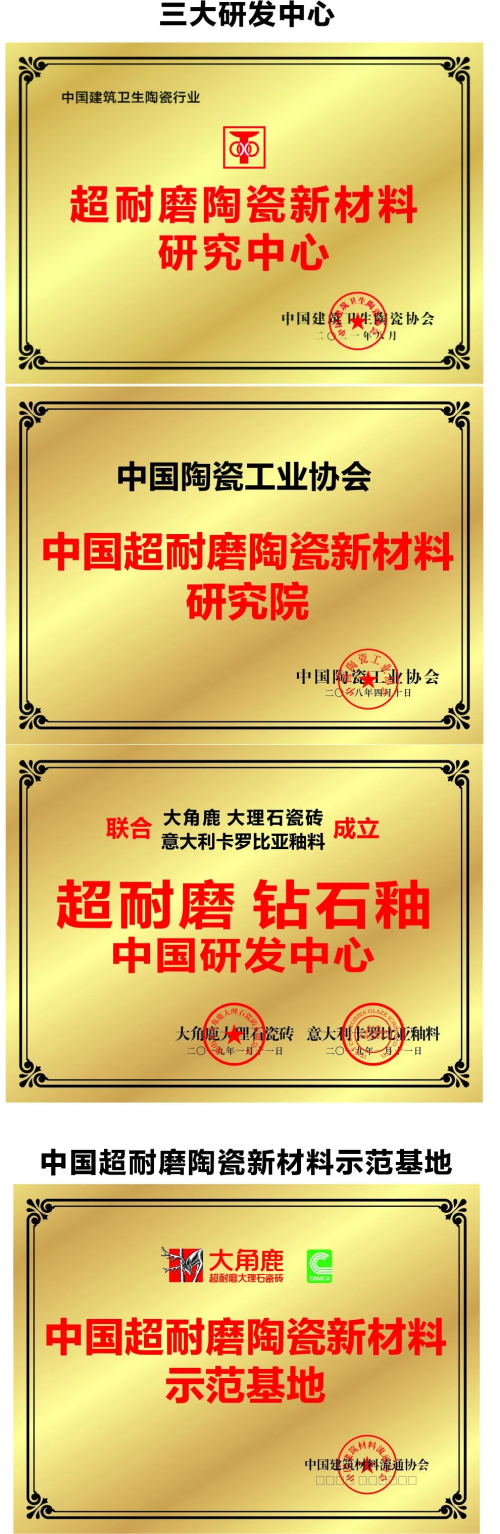 從“中國(guó)制造”到“中國(guó)智造”,科技創(chuàng)新持續(xù)引領(lǐng)企業(yè)高質(zhì)量發(fā)展,大角鹿堅(jiān)定不移貫徹創(chuàng)新驅(qū)動(dòng)發(fā)展戰(zhàn)略,擁有中國(guó)建筑衛(wèi)生陶瓷協(xié)會(huì)授予的“超耐磨陶瓷新材料研究中心”、中國(guó)陶瓷工業(yè)協(xié)會(huì)授予的“中國(guó)超耐磨陶瓷新材料研究院”和聯(lián)合意大利卡羅比亞釉料公司成立的“超耐磨鉆石釉中國(guó)研發(fā)中心”三大研發(fā)中心以及中國(guó)建筑材料流通協(xié)會(huì)授予的“中國(guó)超耐磨陶瓷新材料示范基地”,將引領(lǐng)全球的超耐磨技術(shù)與空間裝飾融合創(chuàng)新,助力陶瓷行業(yè)轉(zhuǎn)型升級(jí)。