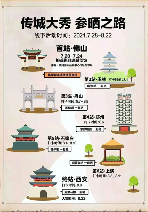 回顧過去,格萊斯在十三朝古都打響終端各地第一季非遺融合計劃的第一站。時至今日,格萊斯再次延續(xù)今年非遺融合計劃的“無界·傳城”主題,將此次非遺質(zhì)造營&818品牌日無界傳城大賞暨第三代香云紗巖板終端首秀落定于此地,并與玉林、舟山、鄭州、石家莊、上饒五大分會場進(jìn)行全國直播聯(lián)動盛典,繼續(xù)深化格萊斯“非遺文化”IP印記,將“使用,就是最好的傳承”傳遞給更多的人。