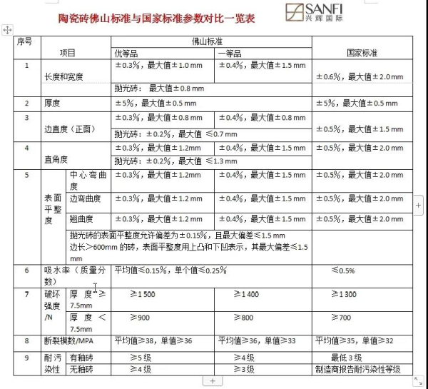 陶瓷磚國(guó)家標(biāo)準(zhǔn)與佛山標(biāo)準(zhǔn)參數(shù)對(duì)比一覽表