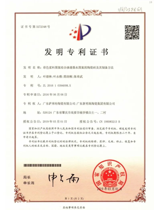 歷經(jīng)嚴(yán)格審查,「彩妝」系列巖板由國家知識產(chǎn)權(quán)局授予的專利產(chǎn)權(quán),并頒發(fā)【發(fā)明專利】證書。同時,今年7月經(jīng)鑒定委員會審議,“大規(guī)格彩色瓷面陶瓷巖板的研制及產(chǎn)業(yè)化”達(dá)國際領(lǐng)先水平。