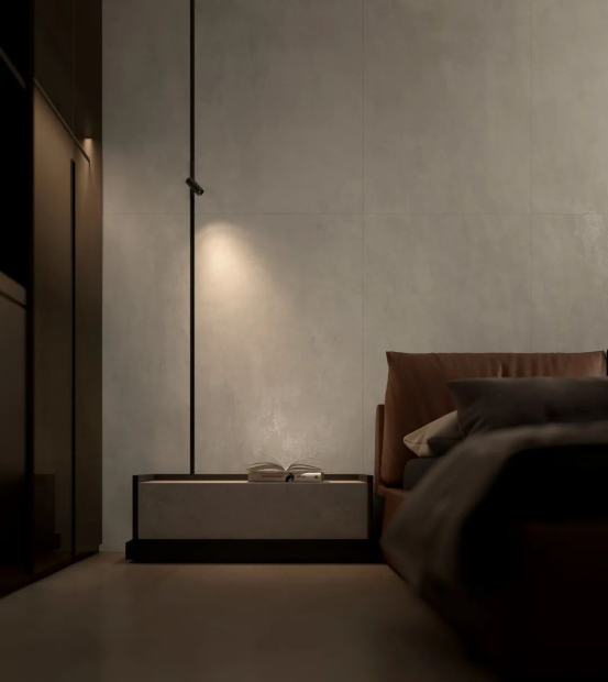 柔柔的燈光襯托下,臥室以最少的元素,濃縮了對(duì)生活和自然的思考,純粹、簡單、安靜,加上輕紋理的墻地用磚,給空間更多留白,可以容納一切,讓生活留出更多思考空間。