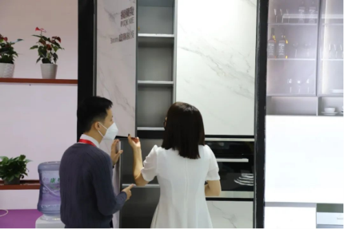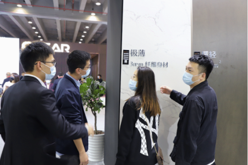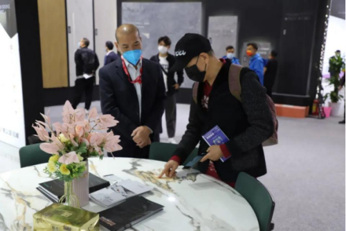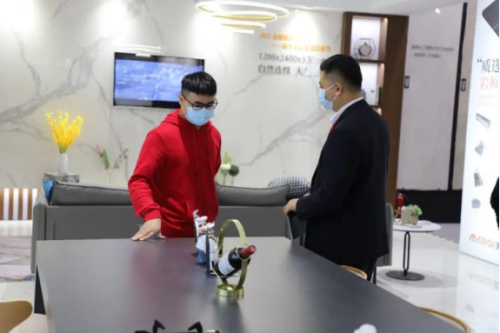 雖然受疫情影響安檢工作嚴格了許多,但仍然沒能阻擋觀眾客戶前來觀展的熱情。開展不久,美爾奇巖板展館已是人頭攢動。來參觀的觀眾無一不被美爾奇巖板強大的產品力和表現(xiàn)力所吸引,紛紛咨詢詳情、打卡留念。