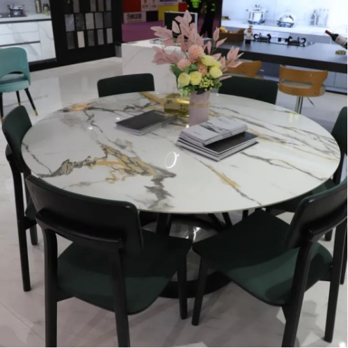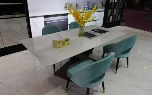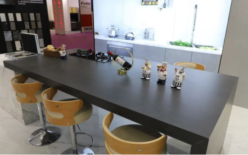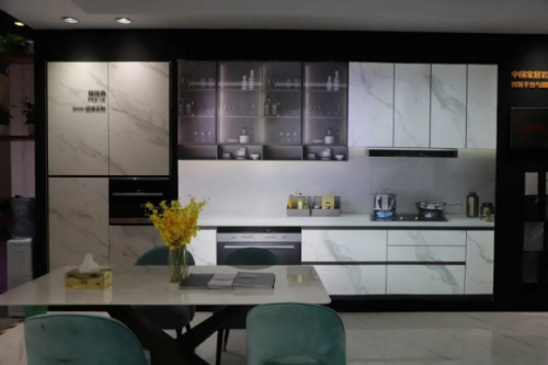 在美爾奇展館,以巖板為材料打造的櫥柜、中島臺、餐桌、茶幾、電視柜等家具受到了不少關注,美爾奇以做工精美、質感出眾的巖板家具向公眾展示了正在到來的全巖家居時代。巖板優(yōu)異的物理化學性能所造就的可加工性,很好地還原了設計師的創(chuàng)意和想法,它已成為高定家居中一個不可或缺的角色。