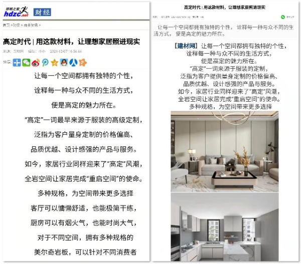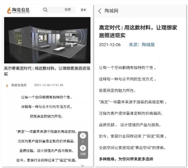 本屆高定展,美爾奇圍繞顏值、個性、功能、美學(xué)等關(guān)鍵詞,向人們展示了正在到來的全巖家居時代,這也引起了眾多媒體的關(guān)注報道。中國建材網(wǎng)、陶城網(wǎng)、陶瓷信息、華夏陶瓷網(wǎng)、鳳凰網(wǎng)、美家網(wǎng)、搜狐焦點(diǎn)家居等數(shù)十家權(quán)威媒體均對美爾奇參展盛況進(jìn)行了重點(diǎn)報道,美爾奇“向美而生,重構(gòu)高定空間”成為行業(yè)熱議的話題。