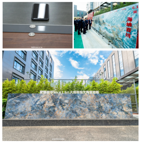 在蒙娜麗莎特高板數(shù)智化示范車間,你會看到這一幕幕,整潔寬敞的數(shù)字車間,光潔如新的亮堂地面,自動化工作的機器設備,少數(shù)幾個工人在維持設備的運行。同時,你還能看到,松軟的粉料蛻變?yōu)橐粔K塊巖板的全過程。3mm高強韌超薄巖板、6100×1830×10.5(mm)高性能大規(guī)格陶瓷大板、9000×1800×10.5(mm)大規(guī)格拋光陶瓷巖板均生產于蒙娜麗莎特高板數(shù)智化示范車間,屢屢刷新蒙娜麗莎“智造”新高度。