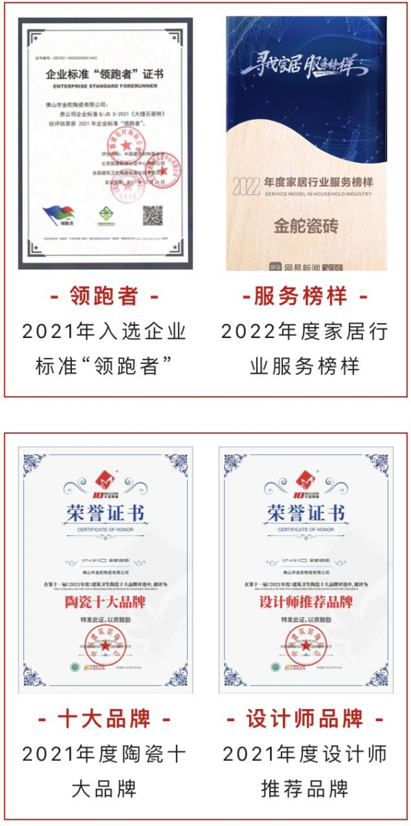 憑借強(qiáng)大的品牌實(shí)力以及堅(jiān)守對品質(zhì)的追求,金舵被評為2022年度家居行業(yè)服務(wù)榜樣,2020年-2021年連續(xù)入選企業(yè)標(biāo)準(zhǔn)“領(lǐng)跑者”,2021中國家居冠軍榜匠心質(zhì)造品牌,2021陶瓷十大品牌以及設(shè)計(jì)師推薦品牌。