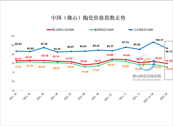 2022年3月份佛山陶瓷價格指數(shù)重回低谷期,總指數(shù)報79.88點,環(huán)比跌2.88%,同比跌3.49%;建筑陶瓷系列指數(shù)76.08點,環(huán)比跌3.43%,同比跌6.09%;衛(wèi)生陶瓷系列指數(shù)96.51點,環(huán)比跌6.67%,同比漲3.39%。三大類指數(shù)同步下跌,市場交易活躍度減弱,需求明顯下滑。