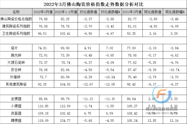 3月份,雖然企業(yè)全面恢復生產(chǎn),但受原材料持續(xù)漲價及疫情防控升級及房產(chǎn)退潮影響,建材需求萎縮,市場遇冷,佛山陶瓷三類指數(shù)同步下滑。