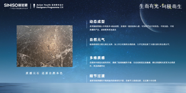 在現(xiàn)場和云端熱烈的氛圍之下,發(fā)布會迎來了第三浪潮——新巖素新品隆重面世。新巖素產品與市場管理中心產品經(jīng)理李小霞為大家分享了新品「極光巖板」的研發(fā)靈感和背后故事,并對「沁光玉巖」「繁星微光」「質感元石」三大系列產品做重磅發(fā)布。